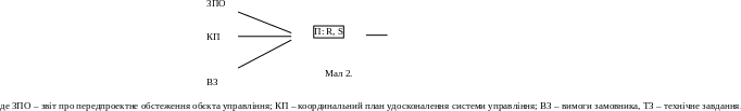 е V - вектор входу по відношенню до даної ТО, який складається з множини компонентів входу {Vi}, i=1, I; П - перетворювач ТО; W - вектор виходу по відношенню до ТО, який складається з множини компонентів виходу { Wj}, j=1,J; R - ресурси, які необхідні для виконання ТО; S - засоби проектування, які використовуються при виконанні ТО.