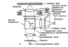Излучение лазера пропускается через диффракционную решетку. Решетка формирует главный луч и боковые лучи (см. рис. 10), которые необходимы для работы системы автотрекинга. Далее через конденсорную линзу излучение попадает на поляризационно-расщепляющую призму. На выходе призмы луч приобретает линейную (параллельную) поляризацию.