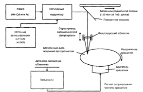 Запись осуществляется на диск, выполненный из полированного стекла, на который нанесен слой фоторезиста толщиной 0.1 ÷ 0.13 мкм. В процессе записи модулированный луч лазера засвечивает фоторезист. После записи фоторезистивный слой проявляют. Засвеченные участки растворяются, образуя углубления (питы). Поверхность проявленного диска покрывают тонким слоем серебра. Затем методами гальванопластики формируют цельнометаллический оригинал. Рельеф оригинала переносят на промежуточные копии, а с копий – на матрицы. Тиражирование дисков осуществляется одним из трех способов: методом горячего прессования, литьем под давлением или способом фотополимеризации.