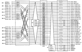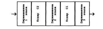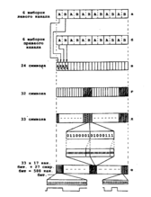 Обе последовательности поступают на входы мультиплексора, который объединяет их в одну последовательность, но с удвоенной частотой следования (88.2 кГц). Кроме того, последовательность делится на кадры – блоки, содержащие 6 отсчетов левого и 6 отсчетов правого каналов. Частота следования кадров равна 88.2/12 = 7.35 кГц. Наконец, 16-разрядные числа делятся на два 8-разрядных числа (байта). Частота следования байтов 88.2 * 2 = 176.4 кГц. Каждый кадр содержит 24 байта. Эти преобразования иллюстрируются рисунком 2 а, б, в. В таком виде последовательность поступает на блок защиты от ошибок. Ошибки могут возникать из-за дефектов дорожки записи (царапины и т.п.). Повреждения могут быть короткие (поврежден один символ) и охватывающие несколько символов (и, даже, кадров). Короткие повреждения обнаруживаются и исправляются кодами. Чтобы код мог обнаружить и исправить цепочку поврежденных символов, их нужно разбросать и вставить между неповрежденными символами. Эта идея использована при построении блока защиты от ошибок. Схема обработки последовательности чисел в блоке показана на рис. 3, а полная схема перестановок и обработки – на рис. 4. Сначала производится 1 перемежение (перестановка) символов (байтов). Цифра в овале на рис. 4 означает задержку на 2 кадра. Затем производится обнаружение и исправление ошибок первым кодером С2. Используется код Рида-Соломона с образующим многочленом