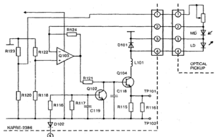 LD – лазер; MD – фотодиод; Q103 – усилитель; Q104 – транзистор, регулирующий ток лазера.