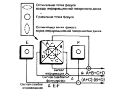 В зависимости от положения диска цилиндрическая линза создаёт на основной матрице световое пятно круглой формы, если фокусировка – правильная, и эллиптической формы, если диск не в фокусе. Причем положение большой оси эллипса зависит от знака отклонения. Это позволяет сформировать информационный сигнал (А+В+С+D) и сигнал ошибки фокусировки ((А+С)-(В+D)). Сигнал ошибки фокусировки усиливается и поступает в катушку, управляющую положением объектива, т.е.обеспечивается автоматическая фокусировка луча. Излучение боковых лепестков создаёт на поверхности диска два пятна, которые при правильном положении основного луча располагаются справа и слева от дорожки. Свет, отраженный от этих пятен, принимается фотодиодами Е и F. Сигналы этих фотодиодов формируют сигнал ошибки трекинга Е – F, восстанавливающий правильное положение основного луча на дорожке записи. Информационный сигнал, снятый с фотоприёмника, не может быть декодирован, т.к. имеет форму импульсов далекую от прямоугольной (см. рис. 12).