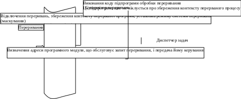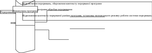 На мал.1 показано, що при виникненні запиту на переривання природний хід обчислень порушується і керування передається програмі обробки переривання. При цьому засобами апаратури зберігається (як правило, за допомогою механізмів стекової пам'яті) адреса тієї команди, з якою варто продовжити виконання перерваної програми. Після виконання програми обробки переривання керування повертається перерваній раніше програмі за допомогою занесення в покажчик команд збереженої адреси команди.