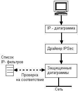 Это локальный, резидентный агент, который просматривает все IP-пакеты на соответствие фильтру IP. Если он находит соответствие, то задерживает пакеты в очереди, в то время как служба ISAKMP/Oakley генерирует необходимую SA и ключ, чтобы защитить обмен информацией. Агент, получив эту информацию от службы ISAKMP, шифрует IP-пакеты и посылает их компьютеру-адресату (рис. 4). Драйвер IPSec запускается агентом политики.