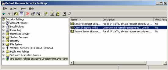 Каждая конфигурация атрибутов безопасности IP называется политикой безопасности. Политика безопасности базируется на политиках установления соединений и IP-фильтрах. Политика безопасности связана с политикой контроллера домена. Политика безопасности IP может быть приписана к заданной по умолчанию политике домена, заданной по умолчанию локальной политике или созданной пользовательской политике домена. Во время регистрации компьютера в домене автоматически подбираются реквизиты заданной по умолчанию политики домена и заданной по умолчанию локальной политики, включая политику безопасности IP, приписанную к этой политике домена.