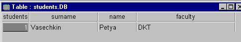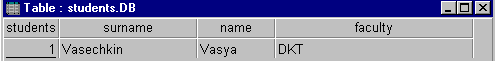 нструкція VALUES вставляє в таблицю students один рядок, параметри VALUES: (“Vasechkin”, “Vasya”, ”DKT”) записуються у відповідні поля таблиці.
