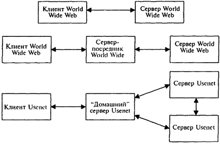 Принципиальным различием между схемой с посредником и схемой Usenet является то, что при посреднике работа по доступу к ресурсу перекладывается на его плечи. При этом он будет устанавливать соединение с каждым сервером в сети. По схеме Usenet это делать не обязательно, так как информацию в принципе можно получить с любого сервера.
