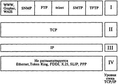 Самый нижний (уровень IV) соответствует уровню доступа к сети, который работает на основе популярных стандартных протоколах физического и канального уровня, таких, как Ethernet, Token Ring, SLIP, PPP и других. Протоколы этого уровня отвечают за пакетную передачу данных в сети на уровне аппаратных средств.