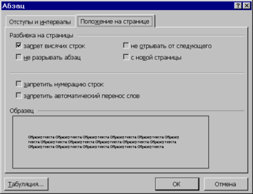 | Не отрывать от следующего | Препятствует вставке разрыва страницы между данным абзацем и следующим |