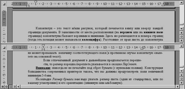 Введем понятие «Колонтитул ». Это – текст и/или рисунок, который печатается внизу или вверху каждой страницы документа. В зависимости от места расположения (на верхнем или на нижнем поле страницы) колонтитулы бывают верхними и нижними. Здесь же размещаются и номера страниц (тогда эта позиция может называться колонцифра). Расстояние от края листа до колонтитула не может превышать величину соответствующего поля (в противном случае колонтитул «налезет» на основной текст).