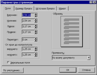 Полями называются расстояния между текстом и краями страницы, когда отступ равен 0. Поля устанавливаются с использованием вкладки Поля команды Параметры страницы пункта меню Файл.