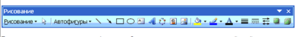 Группа кнопок на панели инструментов Рисование предназначена для изменения цвета и узора заливки графических объектов, цвета и типа линий, цвета шрифта, а также для придания объекту эффекта тени или объема
