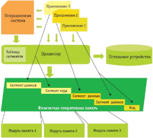 Як же розділити і захистити працюють у фізичної оперативної пам'яті програми один від одного? Найпростіше рішення, яке приходить в голову, - просто «нарізати» цю пам'ять («великий відрізок» адрес) невеликими шматочками (меншими відрізками адрес - сегментами). Кожен такий шматочок задається координатами його «почала» (першим адресою відрізка) і «довжиною» (кількістю адрес). Будь-який адресу цього відрізка вважається як відстань між цією адресою і першим адресою відрізка («зміщення» від початку сегмента). Замість того щоб працювати з фізичними адресами, програми працюють з цими зміщеннями і сегментами, - реалізувати це зовсім не так вже й важко, причому, виділивши кожній програмі навіть не по одному, а по кілька сегментів - сегмент для машинного коду програми, сегмент для її даних, сегмент для організації стека, і т.д.