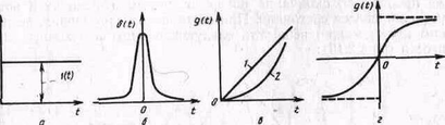 Виды типовых воздействий. Поведение САР существенно зависит от величины и характера воздействий на систему. При рассмотрении конкретных условий работы системы оказывается возможным выбрать такой вид воздействий, который для данной системы был бы наиболее типичным или наиболее неблагоприятным. Изучив переходный процесс, вызванный этим видом воздействий, можно судить о динамических свойствах системы.