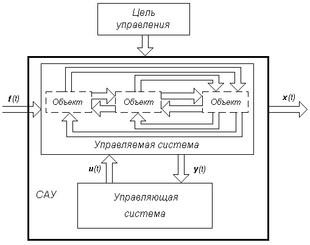 Система автоматического управления (САУ) представляет собой совокупность объекта управления и управляющей подсистемы (системы), подчиненных общей цели управления. Однако САУ могут состоять из нескольких объектов, объединенных единством цели управления (рис. 6). В качестве таковых можно рассматривать, например, участок производства, цех завода или даже сам завод.