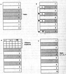Рис. 4. Физическая организация файла: непрерывное размещение (а); связанный список кластеров (б); связанный список индексов (в); перечень номеров кластеров (г)