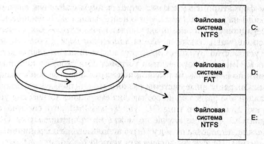 В частном случае, когда все дисковое пространство охватывается одним разделом, логическое устройство представляет физическое устройство в целом. Если диск разбит на несколько разделов, то для каждого из этих разделов может быть создано отдельное логическое устройство. Логическое устройство может быть создано и на базе нескольких разделов, причем эти разделы не обязательно должны принадлежать одному физическому устройству. Объединение нескольких разделов в единое логическое устройство может выполняться разными способами и преследовать разные цели, основные из которых: увеличение общего объема логического раздела, повышение производительности и отказоустойчивости. Примерами организации совместной работы нескольких дисковых разделов являются так называемые RAID-массивы, подробнее о которых будет сказано далее. На разных логических устройствах одного и того же физического диска могут располагаться файловые системы разного типа. На рис. 3 показан пример диска, разбитого на три раздела, в которых установлены две файловых системы NTFS (разделы С и Е) и одна файловая система FAT (раздел D).
