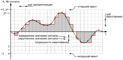 Теперь, для записи каждого отдельного значения амплитуды, его необходимо округлить до ближайшего уровня квантования. Этот процесс называется квантованием по амплитуде. Говоря более формальным языком, квантование по амплитуде – это процесс замены реальных (измеренных) значений амплитуды сигнала значениями, приближенными с некоторой точностью. Каждый из 2 N возможных уровней называется уровнем квантования, а расстояние между двумя ближайшими уровнями квантования называется шагом квантования. Квантование значений сигнала привносит в спектр сигнала дополнительную помеху, называемую шумом квантования или шумом дробления. Шумом (ошибкой) квантования называют сигнал, составляющий разницу между восстановленным цифровым и исходным аудио сигналами. Эта разница образуется в результате округления измеренных значений сигнала. При этом выполняется следующая закономерность: чем выше разрядность квантования, тем ниже уровень шума квантования (поскольку тем на меньшее значение требуется округлять каждое измеренное значение сигнала). Природа шума квантования такова, что ширина спектральной области, в которой он простирается, пропорциональна значению частоты дискретизации.