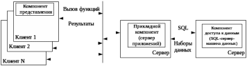 Прикладной компонент системы (библиотеки запросов, процедуры обработки данных) полностью размещается и выполняется на клиентской установке. При реализации своих функций прикладной компонент формирует необходимые SQL-инструкции, направляемые SQL-серверу. SQL-сервер, представляющий специальный программный компонент, ориентированный на интерпретацию SQL-инструкций и высокоскоростное выполнение низкоуровневых операций с данными, принимает и координирует SQL-инструкции от различных клиентов, выполняет их, проверяет и обеспечивает выполнение ограничений целостности данных и направляет клиентам результаты обработки SQL-инструкций, представляющие, как известно, наборы (таблицы) данных.