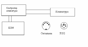 Клавіатура призначена для вводу данних та керування роботою ПК. Для кожного символа призначена окрема клавіша, натиснувши на яку ви забезпечуєте ввод необхідного символа, кожен символ кодується 8-ми битним кодом . Клавіатура має 101-108 клавіш та декілька клавіш індикаторів, які говорять про нинішній режим роботи клавіатури.