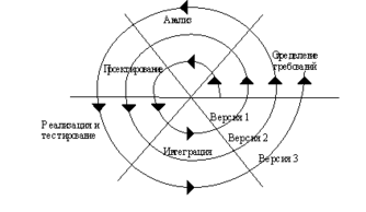 Спиральная модель (рис. 2.3). На каждом витке спирали выполняется создание очередной версии продукта, уточняются требования проекта, определяется его качество, и планируются работы следующего витка. Особое внимание уделяется начальным этапам разработки - анализу и проектированию, где реализуемость тех или иных технических решений проверяется и обосновывается посредством создания прототипов (макетирования).