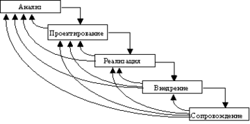 Поэтапная модель с промежуточным контролем (рис. 2.2). Разработка ИС ведется итерациями с циклами обратной связи между этапами. Межэтапные корректировки позволяют учитывать реально существующее взаимовлияние результатов разработки на различных этапах; время жизни каждого из этапов растягивается на весь период разработки.