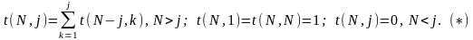 Решение. Для того чтобы подсчитать количество различных разбиений числа N на произвольные натуральные слагаемые, предварительно подсчитаем количества разбиений на следующие группы слагаемых: 1) разбиения только на единицы (очевидно, что для любого числа такое разбиение единственно); 2) разбиения на единицы и двойки такие, что хотя бы одна двойка в разбиении присутствует и т.д. Последнюю группу представляет само число N. Очевидно, что каждое разбиение числа N можно приписать только к одной из рассмотренных групп, в зависимости от значения j — максимального слагаемого в том или ином разбиении. Обозначим количество разбиений в каждой из групп t(N, j). Тогда искомое количество разбиений равно сумме разбиений по всем возможным группам. Введение таких подзадач приводит к несложному способу подсчета числа разбиений. А именно, так как в любом из разбиений j-ой группы присутствует число j, то мы можем вычесть из N число j и сложить разбиения уже числа N – j на слагаемые, не превосходящие j. То есть мы пришли к следующему рекуррентному соотношению: