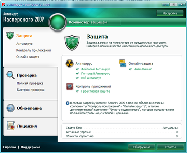 Антивирус Касперского (ранее известный как AntiViral Toolkit Pro; rратко называется KAV - от англ. Kaspersky Antivirus) — антивирусное программное обеспечение разрабатываемое Лабораторией Касперского. Отличается от предыдущей версии наличием технологии HIPS. Предоставляет пользователю защиту от вирусов, троянских программ, шпионских программ, руткитов, adware, а также неизвестных угроз с помощью проактивной защиты, включающей компонент HIPS.
