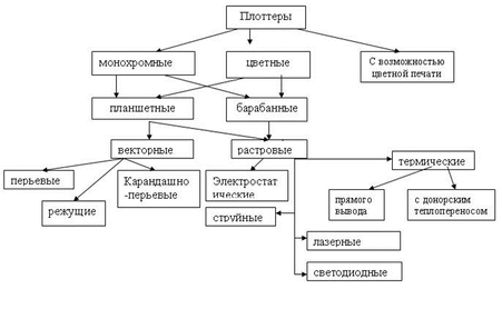 - по используемому инструменту (типу чертежной головки) - перьевые, фотопостроители, со скрайбирующей головкой, с фрезерной головкой.