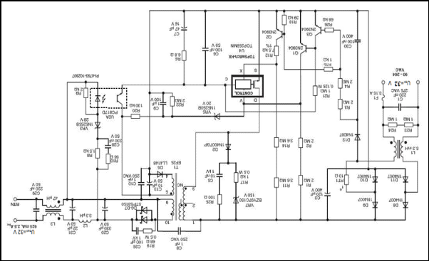 TOP256MN регулирует выходное напряжение путем изменение рабочего цикла встроенного MOSFET транзистора пропорционально току вывода CONTROL.