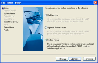 В данном окне система AutoCAD сообщает о том, что параметры плоттеров хранятся в файлах с расширением рсЗ и эти параметры могут быть импортированы из аналогичных файлов с расширением рср и рс2, созданных в 14-й версии AutoCAD. После нажатия кнопки Далее (Next) переходим к следующей, самой важной странице мастера установки плоттеров — Add Plotter — Begin (Установка плоттера — Начало) (рис. 3.6).