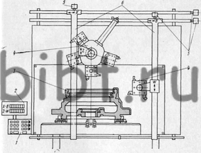 1 – Пульт управления; 2 – Блок цифровой индикации перемещений головок координатографа; 3 – Чертеж обрабатываемой детали;4 – Головки координатографа с шаблонами режущих инструментов, имитирующие суппорты станка; 5 – Приводы перемещений головок координатографа по осям координат; 6 – Координатограф;