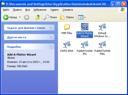 При необходимости добавить настройку нового плоттера или отредактировать существующую настройку следует пользоваться специальным инструментом — Autodesk Plotter Manager (Диспетчер плоттеров Autodesk). Обратиться к этому инструменту можно с помощью команды PLOTTERMANAGER (ДИСППЕЧ) или пункта Plotter Manager (Диспетчер плоттеров) падающего меню File (Файл). Команда PLOTTERMANAGER (ДИСППЕЧ), используя Проводник Windows, открывает папку Plotters (см. рис. 4.4), расположенную глубоко внутри папки Documents and Settings. Указанную папку можно открыть также и другим путем: в Windows открыть Control Panel (Панель управления) и щелкнуть по
