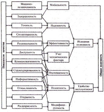 Стрелки в нем указывают логическое отношение следования. Например, если программа удобна в эксплуатации, то она обязательно понятна, она обязательно оказывается структурированной, согласованной и осмысленной, открытой и информативной.