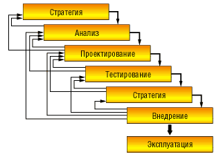 Если разобраться, то так ли уж непредсказуемо развитие системы и действительно ли получить информацию о ней невозможно? Вероятно, представление о системе в целом и о предполагаемых (руководством) путях ее развития можно получить посредством семинаров. После этого разбить сложную систему на более простые компоненты, упростить связи между компонентами, предусмотреть независимость компонентов и описать интерфейсы между ними (чтобы изменение одного компонента автоматически не влекло за собой существенного изменения другого компонента), а также возможности расширения системы и "заглушки" для нереализуемых в той или иной версии системы функций. Исходя из подобных элементарных соображений описание того, что предполагается реализовать в информационной системе, уже не кажется столь нереальным. Можно придерживаться классических подходов к разработке информационных систем, один из которых - схема "водопада" (рис.1) - описан ниже. Кратко будут рассмотрены и некоторые другие подходы к разработке информационных систем, где использование элементов, описанных в схеме "водопада", также допустимо. Какого подхода из описываемых ниже придерживаться (и есть ли смысл придумывать собственный подход) - в какой-то мере дело вкуса и обстоятельств.