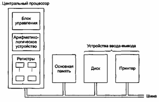 На рис.1 показано устройство обычного компьютера. Центральный процессор — это мозг компьютера. Его задача — выполнять программы, находящиеся в основной памяти. Он вызывает команды из памяти, определяет их тип, а затем выполняет их одну за другой. Компоненты соединены шиной, представляющей собой набор параллельно связанных проводов, по которым передаются адреса, данные и сигналы управления. Шины могут быть внешними (связывающими процессор с памятью и устройствами ввода-вывода) и внутренними.