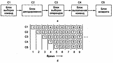 На рис. 2а изображен конвейер из 5 блоков, которые называются стадиями. Стадия С1 вызывает команду из памяти и помещает ее в буфер, где она хранится до тех пор, пока не будет нужна. Стадия С2 декодирует эту команду, определяя ее тип и тип операндов, над которыми она будет производить определенные действия. Стадия СЗ определяет местонахождение операндов и вызывает их или из регистров, или из памяти. Стадия С4 выполняет команду, обычно путем провода операндов через тракт данных. И наконец, стадия С5 записывает результат обратно в нужный регистр.