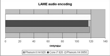 Перекодирование аудио – однопоточная задача, так что разница между всеми тремя участниками теста невелика.