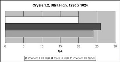 В Crysis отставание Phenom X4 от новичка обусловлено ростом тактовой частоты; Core i7, как всегда, на первом месте.