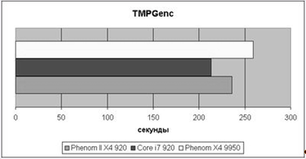 С конвертированием видео ситуация лучше, около 10% отрыва между соревнующимися. Расстановка сил не претерпела изменений – лидирует Core i7, за ним Phenom II X4, и в хвосте "старичок" 9950.