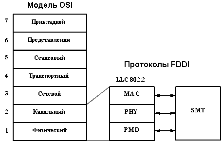 На рисунке приведена структура протоколов технологии FDDI в сравнении с семиуровневой моделью OSI. FDDI определяет протокол физического уровня и протокол подуровня доступа к среде (MAC) канального уровня. Как и многие другие технологии локальных сетей, технология FDDI использует протокол 802.2 подуровня управления каналом данных (LLC), определенный в стандартах IEEE 802.2 и ISO 8802.2. FDDI использует первый тип процедур LLC, при котором узлы работают в дейтаграммном режиме – без установления соединений и без восстановления потерянных или поврежденных кадров.