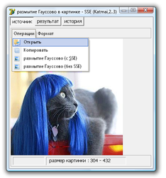 Сравним производительность при использовании оптимизации кода приложения под расширение SIMD процессора SSE и CPU. Тест производился на процессоре Intel® Core™2 Duo CPU T8300 2,4Ghz с поддержкой MMX,SSE-SSE4, EM64T.