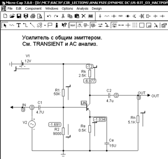 MicroCAP-7 — это универсальный пакет программ схемотехнического анализа, предназначенный для решения широкого круга задач. Характерной особенностью этого пакета, впрочем, как и всех программ семейства MicroCAP (MicroCAP-3… MicroCAP-8) [1, 2], является наличие удобного и дружественного графического интерфейса, что делает его особенно привлекательным для непрофессиональной студенческой аудитории. Несмотря на достаточно скромные требования к программно-аппаратным средствам ПК (процессор не ниже Pentium II, ОС Windows 95/98/ME или Windows NT 4/2000/XP, память не менее 64 Мб, монитор не хуже SVGA), его возможности достаточно велики. С его помощью можно анализировать не только аналоговые, но и цифровые устройства. Возможно также и смешанное моделирования аналого-цифровых электронных устройств, реализуемое в полной мере опытным пользователем пакета, способным в нестандартной ситуации создавать собственные макромодели, облегчающие имитационное моделирование без потери существенной информации о поведении системы.