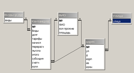 Связь осуществляется по равенству значений в полях связи. Например связь между таблицами Вид услуги и Данные по видам услуг осуществляется по полю Счетчик. Это поле является внешним ключом в таблице Квитанция.