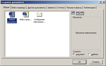 Новые документы легко создаются с помощью Главного меню. Если выбрать в нем пункт «Создать», откроется диалоговое окно Создание документа (рис. 2.7). Каждая вкладка этого окна содержит шаблоны (например, шаблоны факсимильных сообщений), включая текст, графику или другое содержание. Шаблоны пустых документов для всех приложений — баз данных Access, документов Word, электронных таблиц Excel, презентаций PowerPoint — располагаются на вкладке Общие диалогового окна