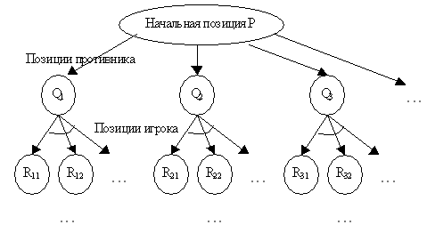 В И – ИЛИ дереве, показанном на рисунке 2, вершины соответствуют позициям, а дуги – возможным ходам. Уровни позиций игрока чередуются в дереве с уровнями позиций противника. Для того, чтобы выиграть в позиции P, нужно найти ход, переводящий Р в выигранную позицию Qi. Таким образом, игрок выигрывает в позиции Р, если он выигрывает в Q1, или в Q2, или Q3, или … Следовательно, Р – это ИЛИ – вершина. Для любого i позиция Qi – это позиция противника, поэтому если в этой позиции выигрывает игрок, то он выигрывает и после каждого варианта хода противника. Другими словами, игрок выигрывает в Qi, если он выигрывает во всех позициях Ri1 и Ri2 и … Таким образом, все позиции противника – это И – вершины.