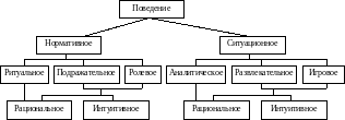 Нормативное поведение определяется набором предписаний, характерных для того общества, к которому принадлежит индивид. Ситуационное поведение определяется той реальностью, в которой оно возникает. Аналитическое поведение характеризуется осознанностью целей и плана их достижения.