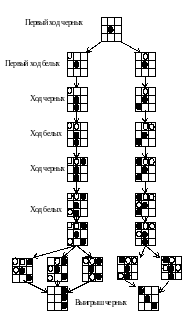 Целевые вершины – это позиции, выигранные согласно правилам игры, например позиции, в которых король противника получает мат. Позициям проигранным соответствуют задачи, которые не имеют решения. Для того, чтобы решить игровую задачу, необходимо построить решающее дерево, гарантирующее победу игрока независимо от ответов противника. Такое дерево задает полную стратегию достижения выигрыша: для каждого возможного продолжения, выбранного противником, в дереве стратегии есть ответный ход, приводящий к победе. Например, для игры в "тик-так-ту" может быть построено полное дерево ходов, которое показано на рисунке 3. Из-за симметрии игрового поля только два ответных хода белых являются различными.