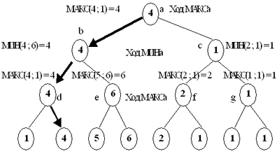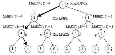 Существует стандартный метод поиска, используемый в игровых программах, основанный на минимаксном принципе. Дерево ходов просматривается по одной из ветвей до максимальной глубины (обычно несколько ходов) и оценивается позиция. Очень многое зависит от оценочной функции, которая для большинства игр, является приближенной эвристической оценкой шансов на выигрыш одного из участников игры. Поскольку один из участников игры стремится к высоким оценкам, а другой - к низким, то им даются имена МАКС и МИН соответственно. МАКС всегда выбирает ход с максимальной оценкой; в противоположность ему МИН всегда выбирает ход с минимальной оценкой. Пользуясь этим минимаксным принципом и зная значения оценок для всех вершин подножия дерева поиска, можно определить оценки всех вышерасположенных вершин дерева. Оценки вершин подножия дерева делаются с помощью некоторой оценочной функции и называются статическими. Затем, двигаясь по дереву снизу – вверх, определяется оценка (динамическая) внутренних вершин.