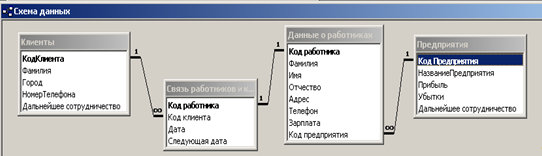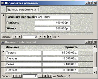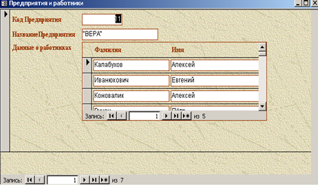 Рис. 6 Связанные формы (нажав на кнопку "Данные о работниках1" в форме "Предприятия – работники" появляется форма "Данные о работниках1")